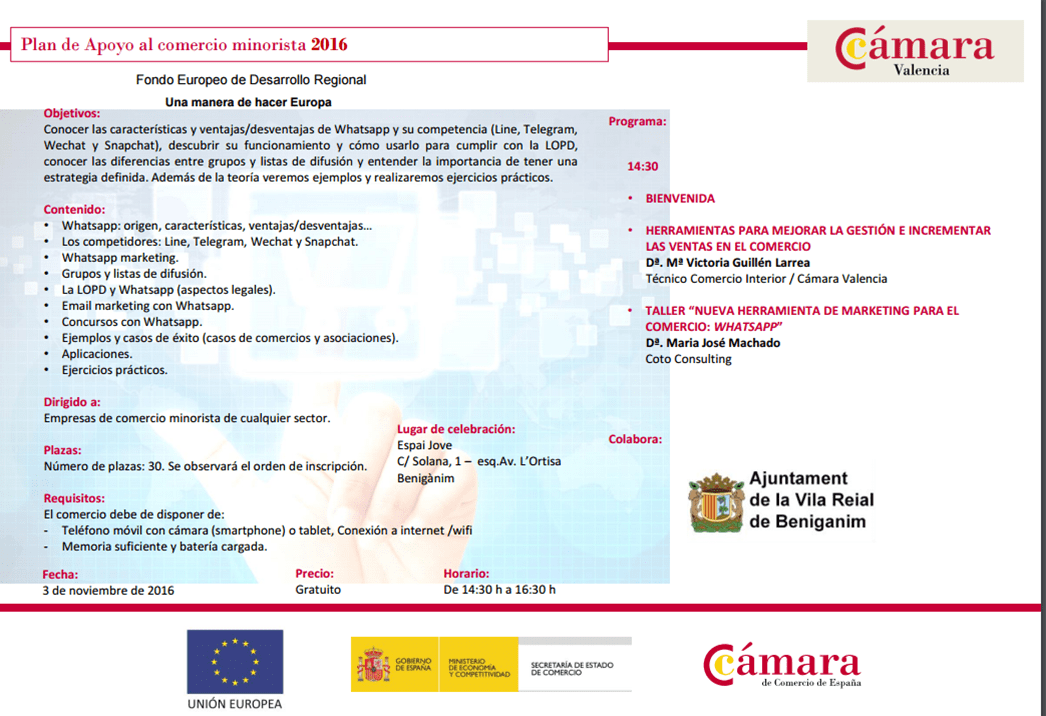 Nuestra consultora y docente de marketing digital, Mª José Machado, impartió ayer el taller «nueva herramienta de marketing para el comercio: Whatsapp» en Benigánim (Valencia). Este taller de Whatsapp Marketing forma parte del ciclo de talleres sobre comercio electrónico que organiza la Cámara de Valencia dentro del Plan de Apoyo al comercio minorista.