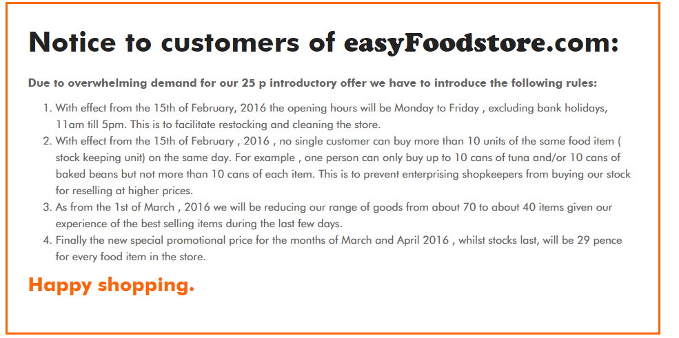 La estrategia de EasyFoodStore es clara: pocas referencias (70 en total), productos de primera necesidad (azúcar, harina, patatas, agua, etc.) aún precio inmejorable. Como reza su slogan «No marcas caras. Sólo comida a un precio honesto» (No expensive brands. Just food honestly priced).