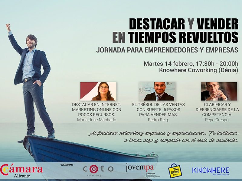 Ayer martes 14 de marzo se desarrolló en Dénia una jornada para emprendedores y empresas organizada por la Cámara de Alicante. El cartel de ponentes estaba compuesto por Mª José Machado, consultora experta en marketing digital y gerente de proyectos digitales de Coto Consulting, Pedro Reig, Sociólogo, consultor de marketing y Director de Coto Consulting y Pepe Crespo, Director del Instituto Prionomy.