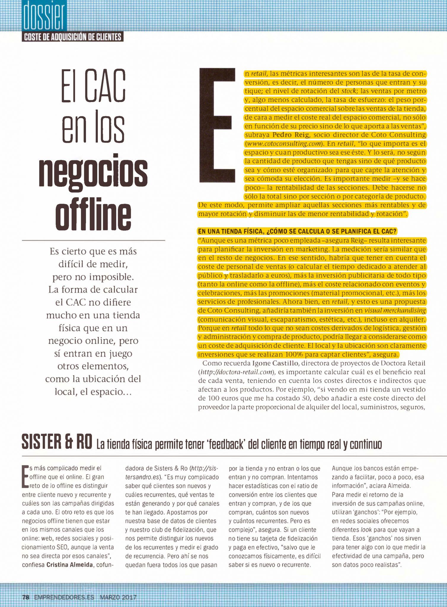 Nuestro gerente, Pedro Reig Catalá, habla sobre el CAC en los negocios offline (Coste de Adquisición de Clientes) en el dossier «Todos los cálculos que debes hacer para captar clientes» de la Revista Emprendedores de marzo.