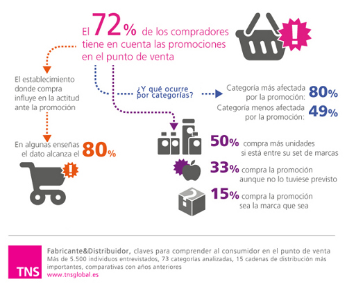 Así, el 72% de los compradores tiene en cuenta las promociones en el punto de venta, aunque este porcentaje varía en función de la categoría comprada, moviéndose entre el 49% en la categoría menos afectada por las promociones (cosméticos y perfumería exclusiva) hasta el 80% en la más afectada (alimentación básica).