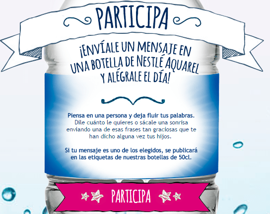 «Mensajes de familia en una botella» es una divertida acción de marketing de Aquarel que permite a los consumidores poner mensajes en las botellas de la marca. Hasta el 31 de agosto puedes enviar un mensaje en una botella de agua de Aquarel, si tu mensaje es uno de los elegidos se publicará en las etiquetas de las botellas de 50cl.