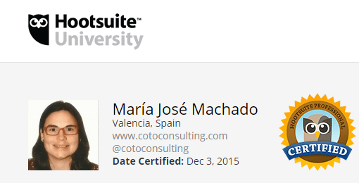 Hoy Mª José Machado, nuestra encargada de ‪‎marketing‬ digital, ha obtenido la certificación «Hoosuite Professional Certified».