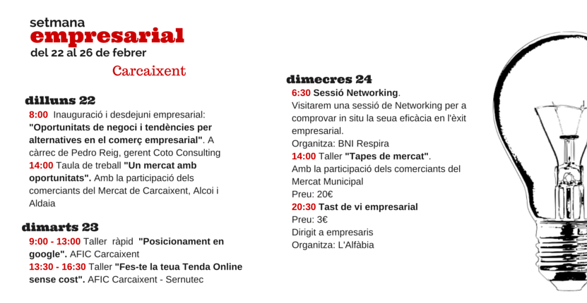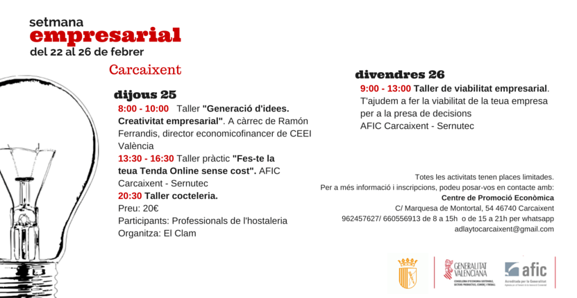 Adjuntamos programa de actividades para la semana y los negocios Carcaixent, del 22 al 26 de febrero. Para más información adlaytocarcaixent@gmail.com o WhatsApp 66055691.