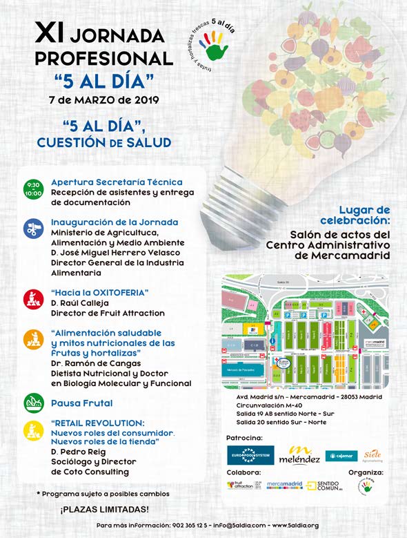 La Asociación “5 al día” organiza el evento que se consolida como punto de referencia para el sector hortofrutícola: XI Jornada Profesional “5 al día”, que se celebrará en el Salón de Actos del Centro Administrativo de Mercamadrid. El próximo 7 de marzo de 2019 es la fecha elegida para esta edición.