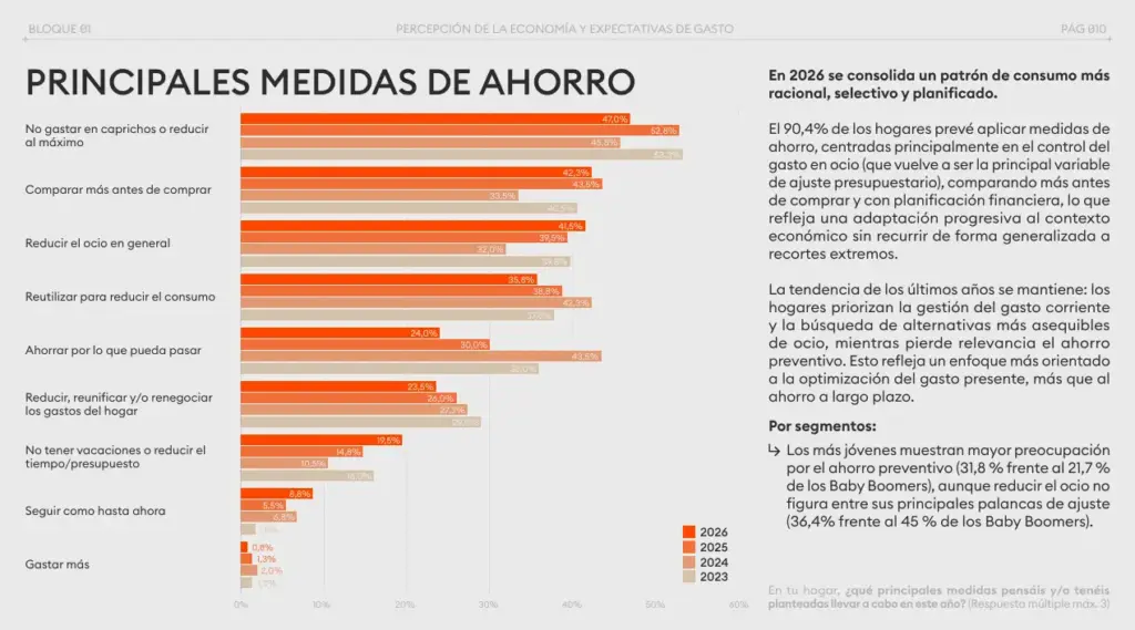 En cuanto a las medidas de ahorro, el informe destaca que este 2026 no es un año de recortes severos, pero se consolidan comportamientos racionales y selectivos entre los que destaca no gastar en caprichos (47%), reducir el gasto en ocio (41,5%) o comparar más antes de comprar (42,3%). Así, el 90,4% de los hogares encuestados prevé aplicar medidas de ahorro durante 2026.