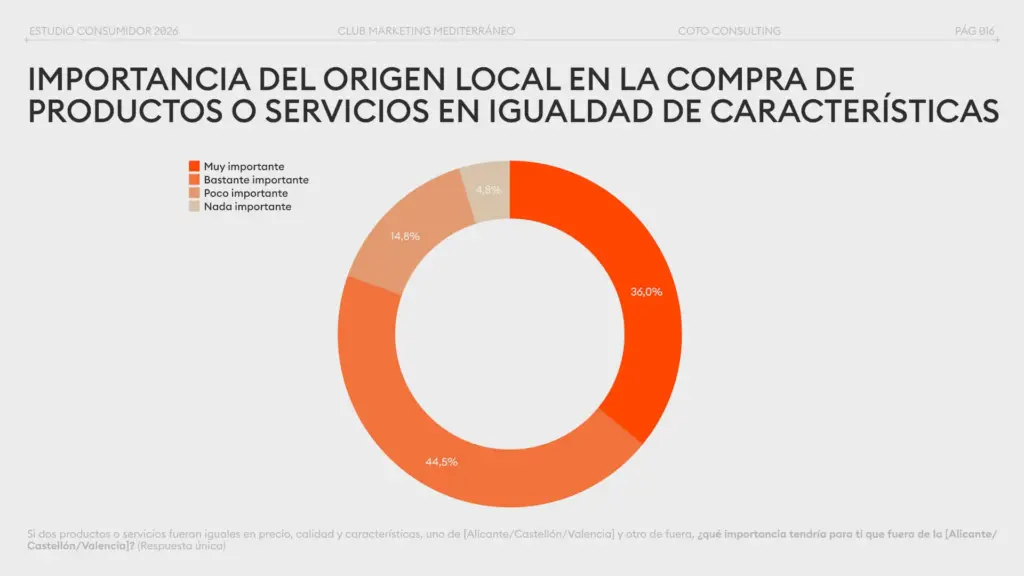 El 80,5% de los consumidores de la Comunitat se decanta por productos y servicios de la “terreta” a la hora de comprar en igualdad de precio y calidad, ya que considera bastante o muy importante que el producto sea de la Comunitat Valenciana. Este dato confirma que la proximidad no solo se valora, sino que puede inclinar la decisión final de compra. El origen o procedencia de la marca es un aspecto valorado por los consumidores valencianos que toma mayor importancia cuando la marca se siente “próxima”. Así, para más del 70% de los encuestados/as es importante o muy importante la procedencia nacional, autonómica y provincial.