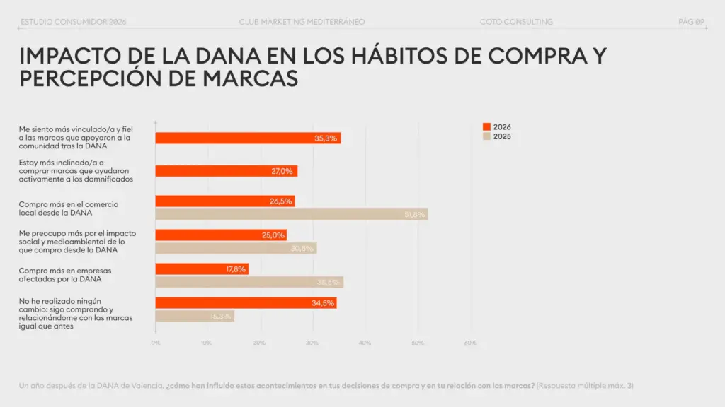 El informe sigue reflejando el impacto de la DANA en los consumidores y destaca cómo, aunque sigue influyendo en la relación con las marcas, su impacto es hoy más emocional que transaccional. En comparación con el momento posterior a la DANA, la intención de compra en el comercio local ha bajado de un 51,8% a un 26,5%, y las compras en empresas afectadas por la DANA, de un 35,8% a un 17,8%. Sin embargo, una parte significativa de los consumidores (35,3%) declara mayor afinidad y fidelidad todavía en 2026 hacia aquellas marcas que mostraron apoyo activo a la comunidad. Así el efecto DANA, evoluciona desde un apoyo directo en la compra, en 2025, hacia una conexión más emocional y valorativa de aquellas marcas que apoyaron a la comunidad y damnificados en este 2026.
