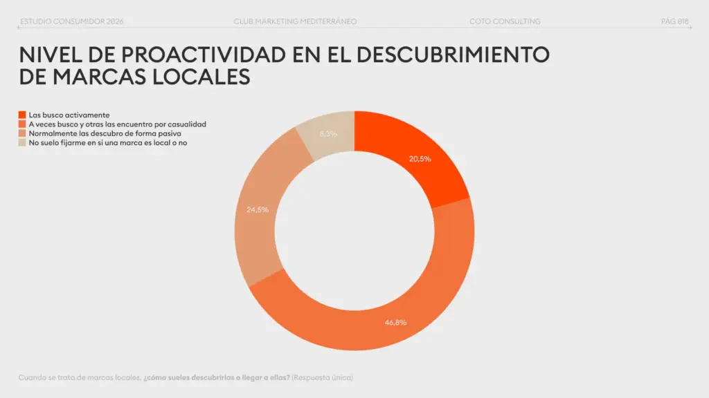 De acuerdo con este estudio, el 46,8% de los encuestados destaca que no siempre tiene el mismo comportamiento respecto a las marcas locales, a veces las busca y otras las encuentra por casualidad. No obstante, un 20,5% afirma buscarlas activamente.