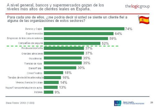 En cuanto a lo que podríamos llamar sentimiento general de fidelidad, la encuesta revela que los sectores que más sentimiento de fidelidad generan entre los consumidores, independientemente de programas de fidelización son bancos y cajas (74% de los encuestados), supermercados (64%), telecomunicaciones (59%) y compañías de seguros (59%).