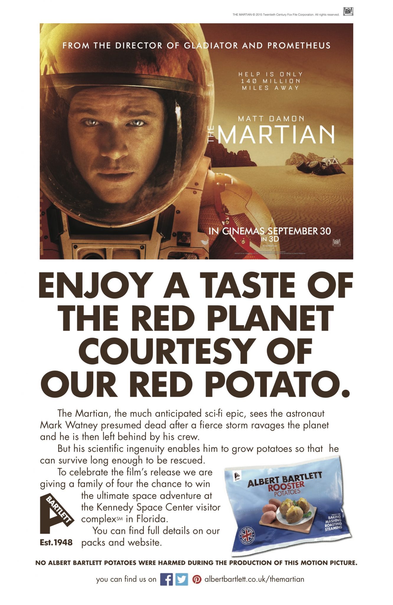 En la película, «Marte» en castellano, el actor Matt Damon hace el papel de un astronauta abandonado en el planeta Marte. Sobrevive en ese terreno hostil durante meses gracias a que consigue sembrar patatas. La empresa irlandesa llegó a un acuerdo para usar la imagen y el DVD de la película como reclamo publicitario. Además, realizaron sorteos para visitar el Kennedy Space Center.