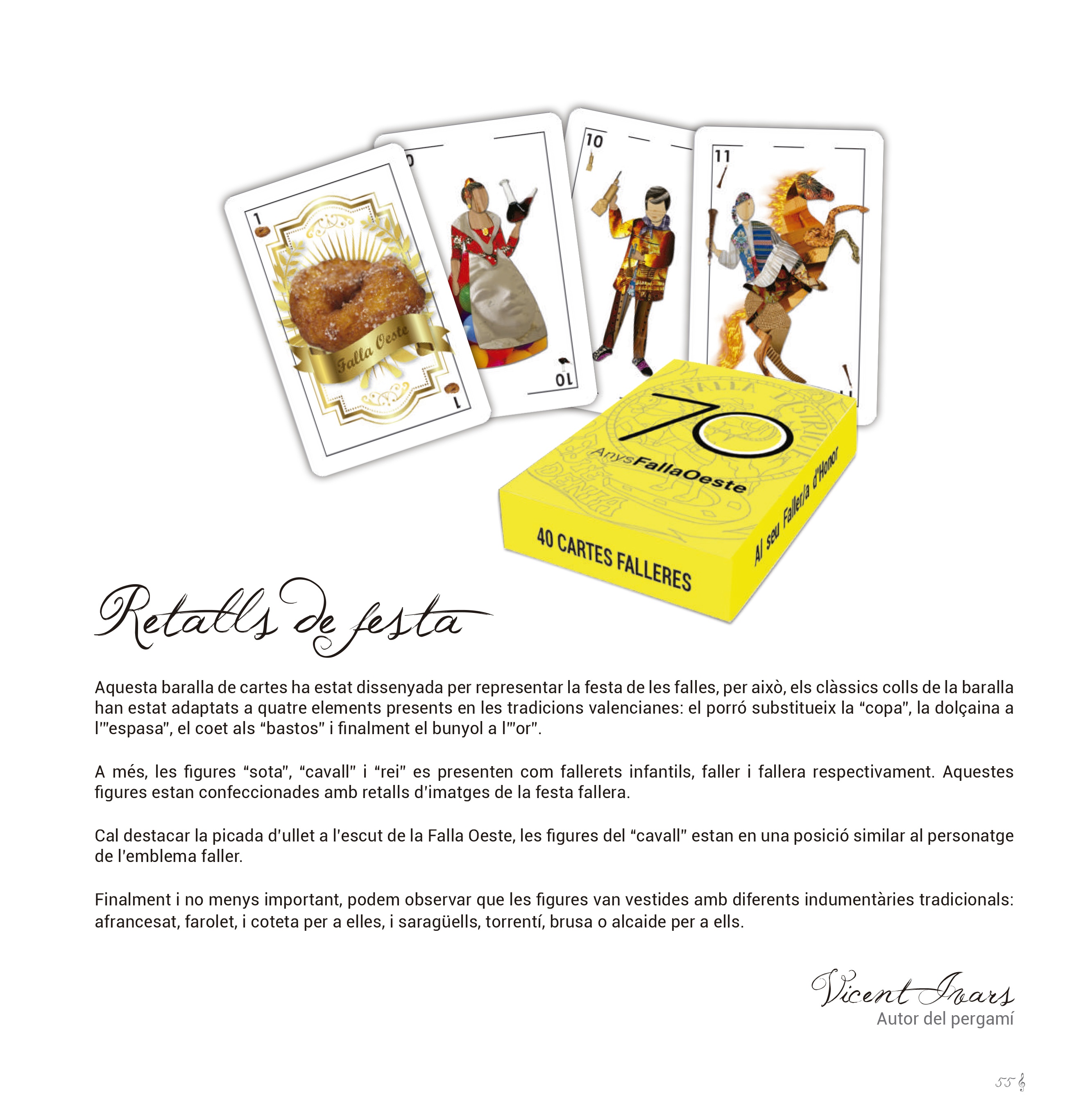El pergamino, diseñado por Vicente Ivars, es una baraja de cartas que lleva el nombre de «Retalls de la festa». La baraja ha sido diseñada para representar la fiesta de las fallas, por eso, los clásicos palos de la baraja han sido adaptados a cuatro elementos presentes en las tradiciones valencianas: El porró sustituya la «copa», al dolçaina a la «espada», el cohete a los «bastos» y finalmente el buñuelo al «oro». Además, las figuras, «sota», «caballo» y «rey» se representan como falleros infantiles, fallero y fallera respectivamente. Estas figuras están confeccionadas con recortes de imágenes de la fiesta fallera. Cabe destacar el guiño de Vicente Ivars al escudo de la Falla Oeste, las figuras del «caballo» están en posición similar al personaje del emblema fallero. Finalmente y no menos importante, podemos observar que las figuras van vestidas con las diferentes indumentarias tradicionales: afrancesat, farolet, i coteta per a elles, i saragüells, torrentí, brusa o alcaide per a ells.